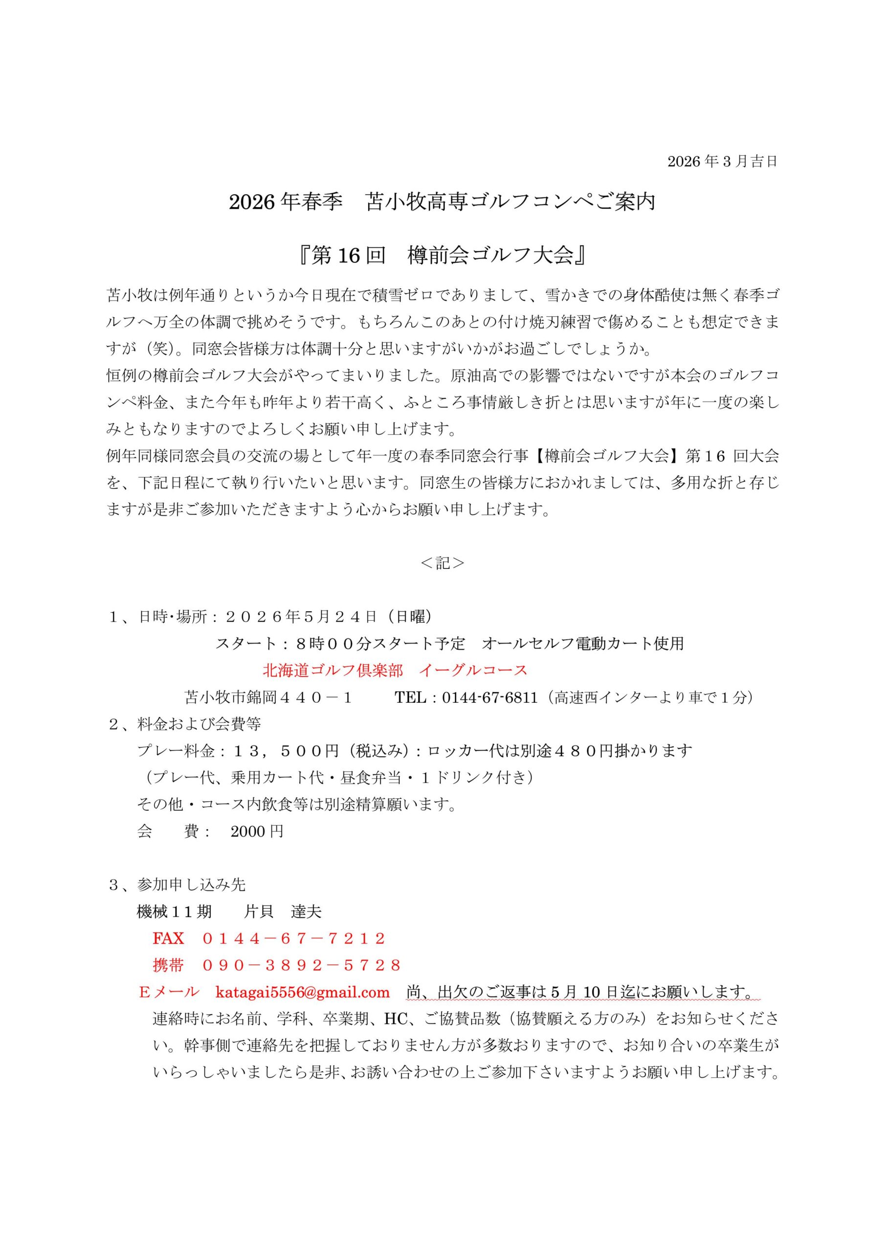 Eメール katagai5556@gmail.com 尚、出欠のご返事は5月10日迄にお願いします。